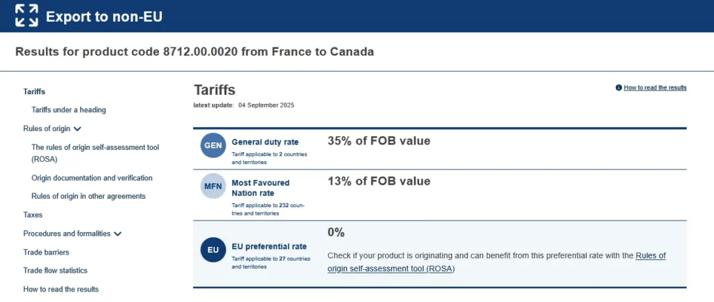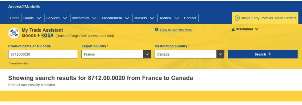 L’un des principaux atouts d’Access2Markets est sa capacité à fournir instantanément les taux de droits de douane applicables à un produit donné dans un pays de destination. Il suffit d’entrer le code douanier (HS code) de votre produit et le pays cible pour obtenir une estimation précise des droits et taxes à l’exportation. Cette fonctionnalité est particulièrement utile pour anticiper les coûts et éviter les mauvaises surprises lors du passage en douane.